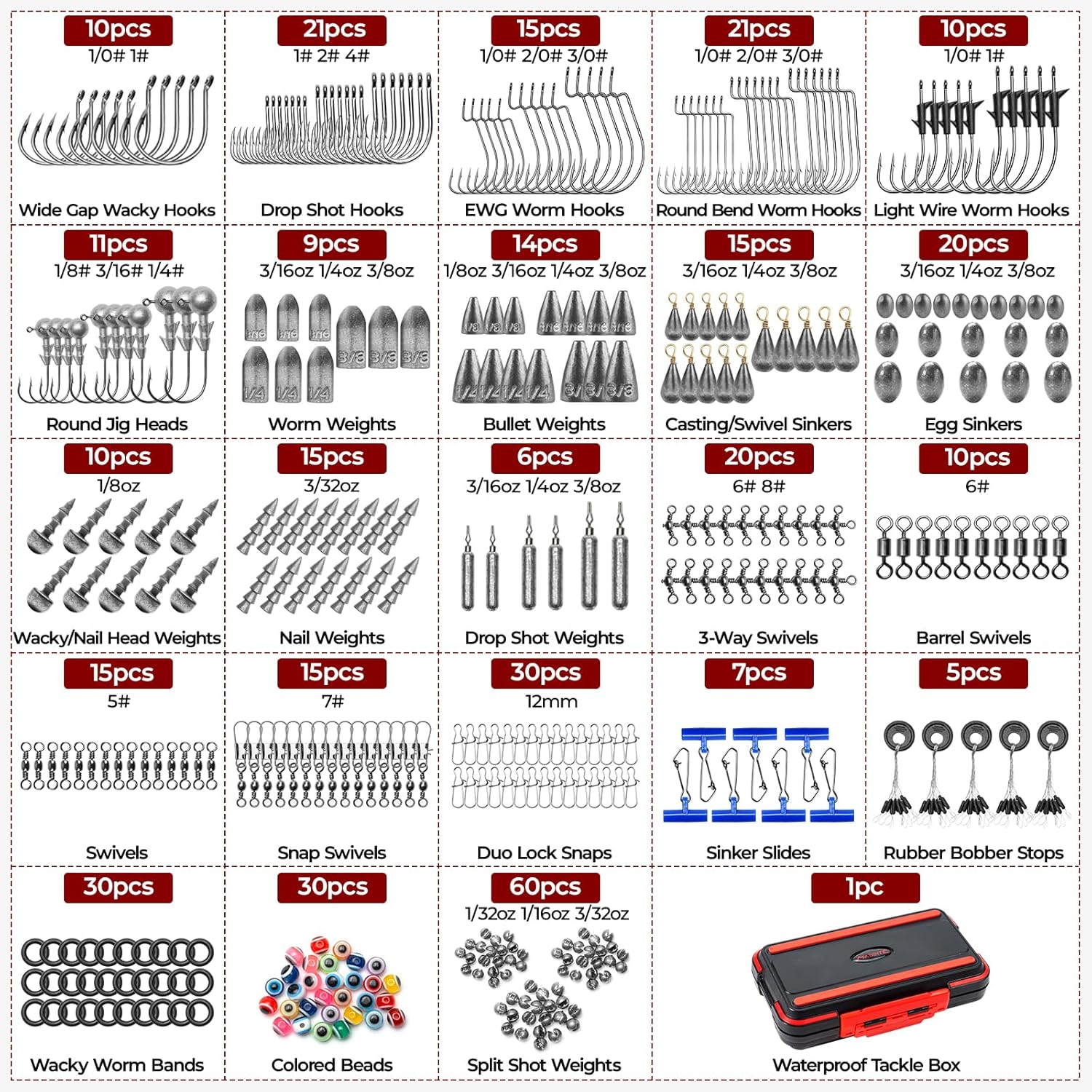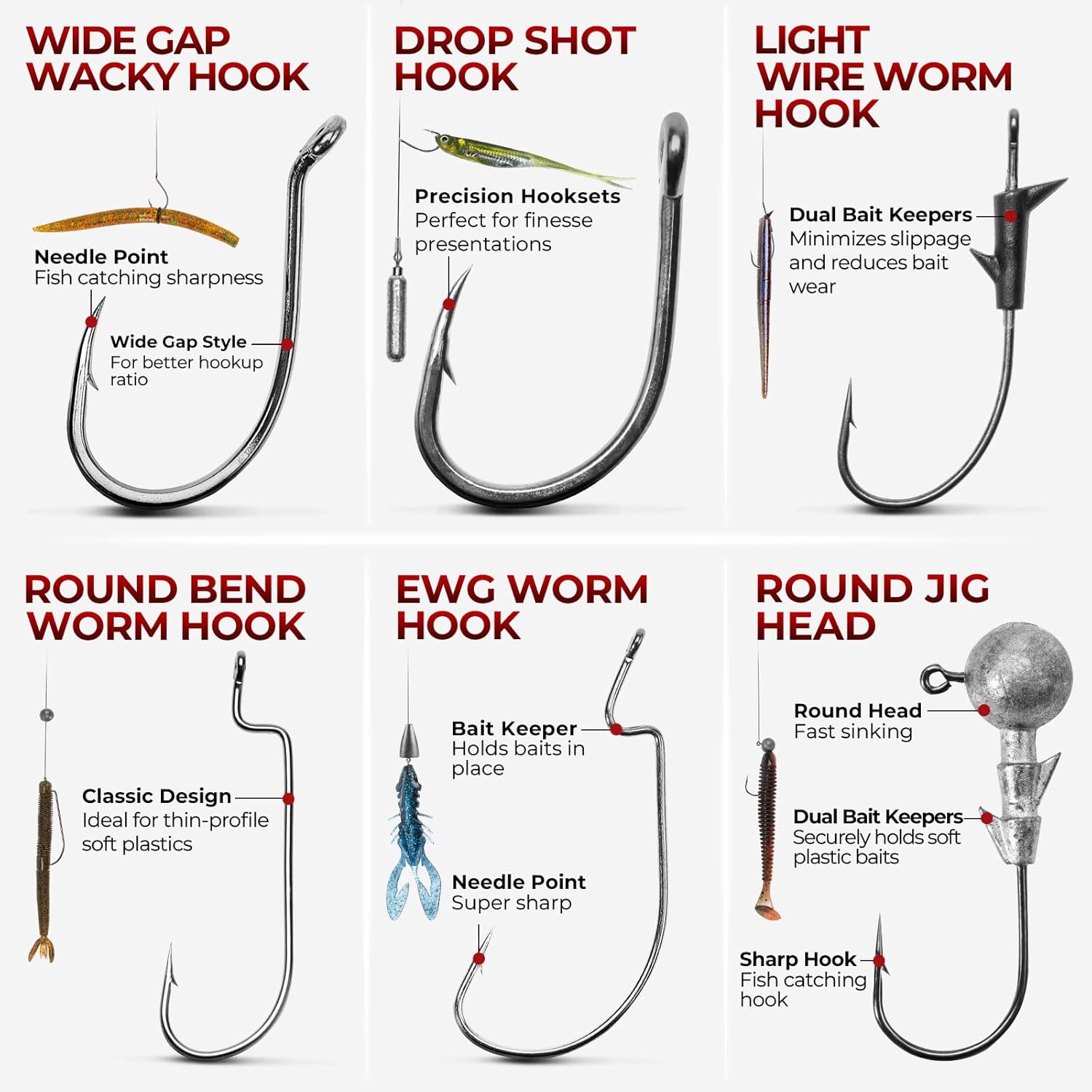 - Optimized Hook Selection for Versatile Rigging: Equipped with five premium hook styles—EWG Worm Hooks, Round Bend Worm Hooks, Wide Gap Wacky Hooks, Light Wire Finesse Hooks, and Drop Shot Hooks—each with needle-point sharpness and bait-retaining features for better hookup ratios and longer-lasting presentations. Includes 2 styles of dual bait keeper jig heads to reduce bait wear and slippage